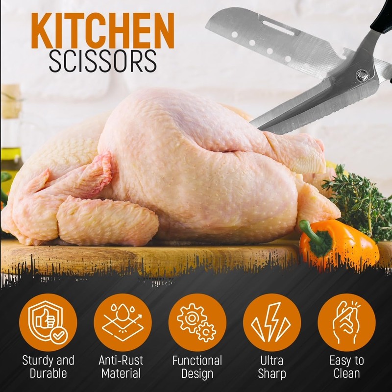 - [Innovative Design] Our multi-purpose kitchen scissors seamlessly transform into two knives, offering unparalleled versatility in your kitchen gadget collection. The blades of heavy duty shears are professional made of premium stainless steel that enables durable, sharp, long cutting life, anti-rust. Micro serrated on blade design enhanced cutting performance for better gripping of slippery materials.