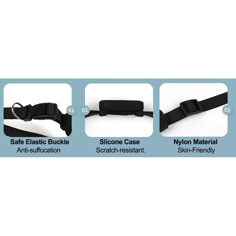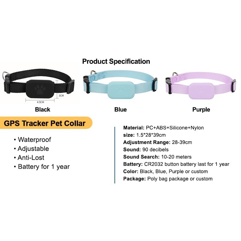 - "GPS Tracking: Monitor your pet's location and activity levels with the built-in GPS tracker and companion app. Easy to set up: A simple one-tap setup instantly connects the pet tracking collar tracker finder to the Find My app on your Apple devices to follow in real-time on your phone. Lightweight & Waterproof: It is made of high-quality nylon, silicone, and ABS. It is solid, resistant, and waterproof. Adjustable Size: It is easy to get a perfect fit around the pet's neck. It is suitable for small, medium, and large dogs and cats. Long Battery Life: It is powered by a CR2032 button battery that has a super long standby time over 12 months and can be easily replaced for long-term use."