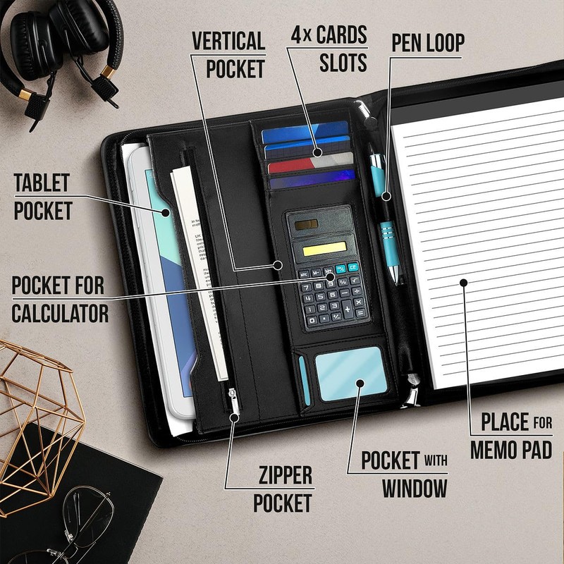• [Professional & Versatile]: Use this durable and elegant padfolio for work, studies, or organizing important documents. Includes a secure organizer with sheet holder, zipper compartment, calculator, and pad of sheets. Perfect for office, interviews, and meetings.