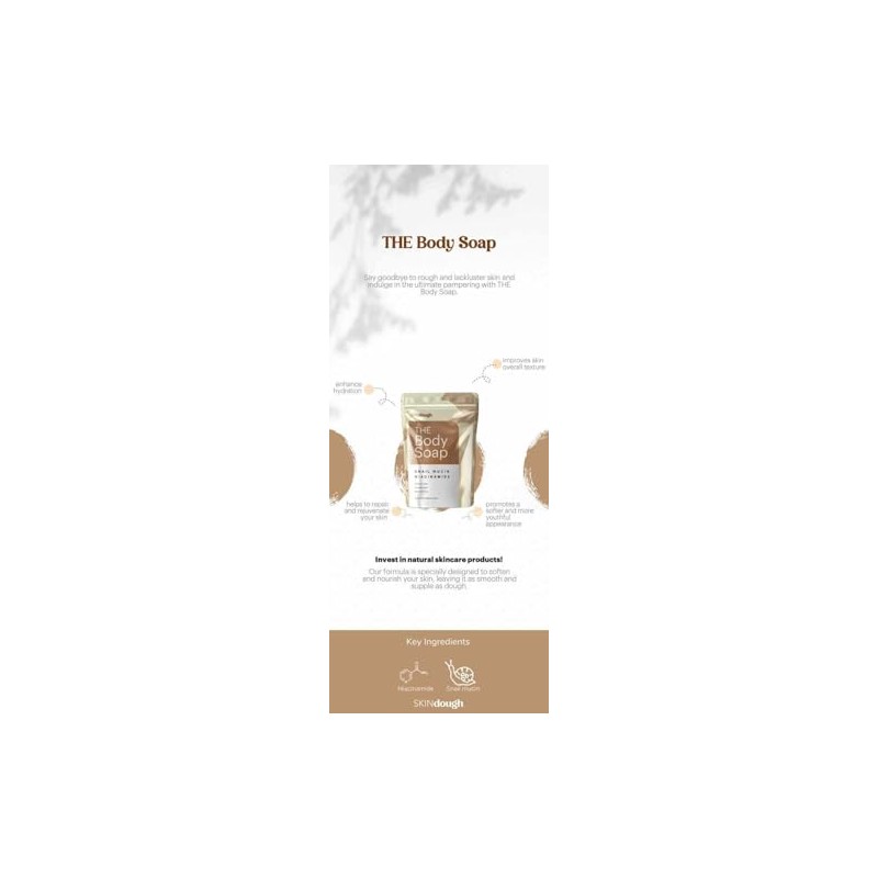 Niacinamide, on the other hand, is a powerful ingredient that helps to improve skin texture, even out skin tone, and reduce the appearance of fine lines and wrinkles. With SkinDough The Body Soap, your bathing routine becomes a self-care ritual. It's a moment to pamper your skin and envelop yourself in luxury. Experience the transformative power of niacinamide and snail mucin as they work together to rejuvenate your skin, leaving it smoother, nourished, and more radiant.