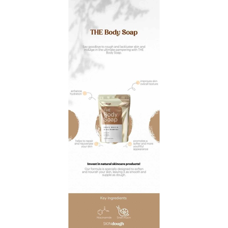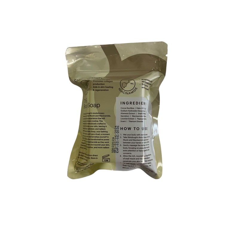 SkinDough The Body Soap is meticulously crafted to provide a premium skincare experience. With the power of Snail Mucin and Niacinamide, this soap works to rejuvenate your skin, leaving it smoother than ever before.