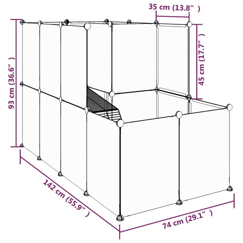 This small animal cage provides spacious and safe enclosed space for your pets to exercise, play and rest. Practical material: The animal house is made of PP plastic panels, which are water and need low maintenance.Strong and stable structure: The steel frames ensure sturdiness and stability.Spacious cage: The pet hutch features a platform and a ladder for your little friends to rest and play while staying safe within the boundaries.User friendly design: The pet cage can be assembled conveniently with the included wood hammer. When not in use, it is easy to separate the panels and stack them to save space.Suitable for small animals: This pet fence offers an excellent play spot for small animals like puppies, kittens, bunnies, hedgehogs, hamsters, guinea pigs, etc. Note:The maximum static load capacity is 10 kg.