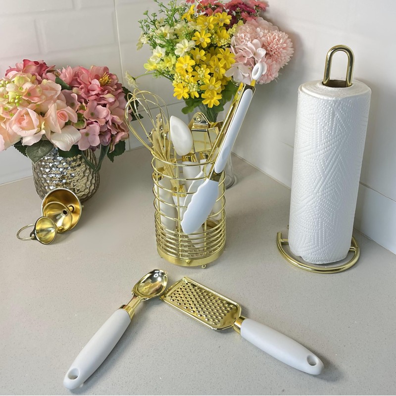 Keep your kitchen clutter-free and organized with the included utensil sets gold holder.This premium Gold Utensils set cooking set not only enhances your cooking space but also makes a statement with its' stylish design. Elevate your culinary journey with our 9-Piece White and Gold Kitchen gold Utensil Set - where style meets functionality!