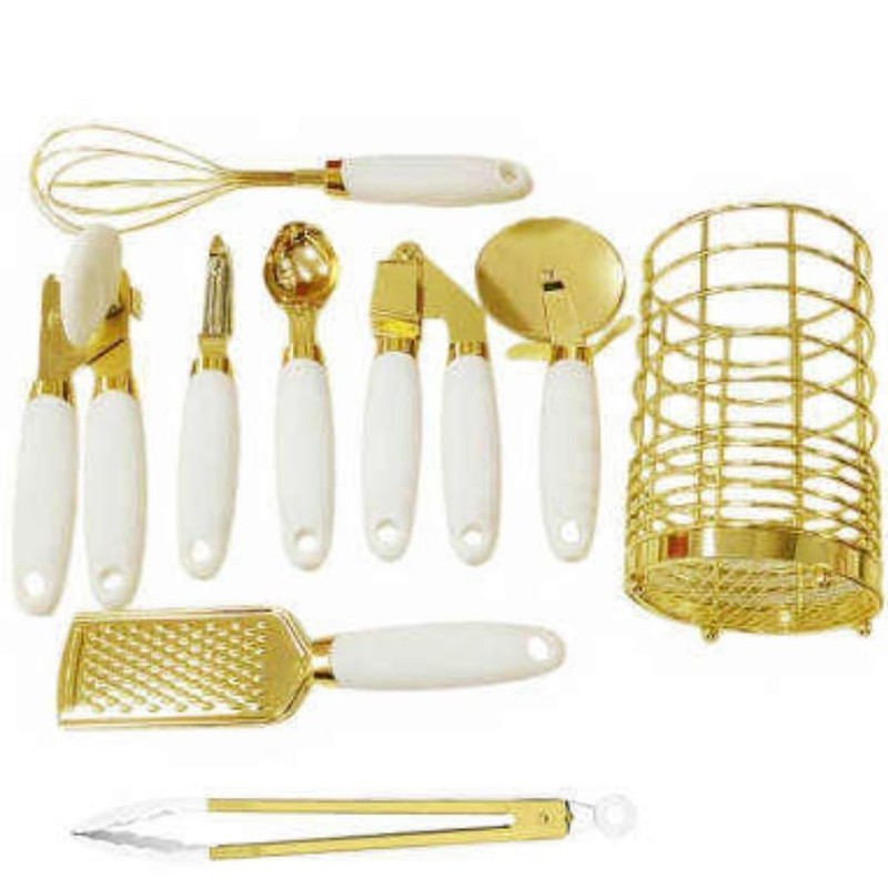 - COMPLETE COOKING SET FOR VERSATILITY: Our cohesive 9-piece Gold cooking utensils set includes a gold whisk, peeler, cheese grater, ice cream scoop, tongs, can opener, garlic press, pizza cutter and a matching holder for organized convenience.