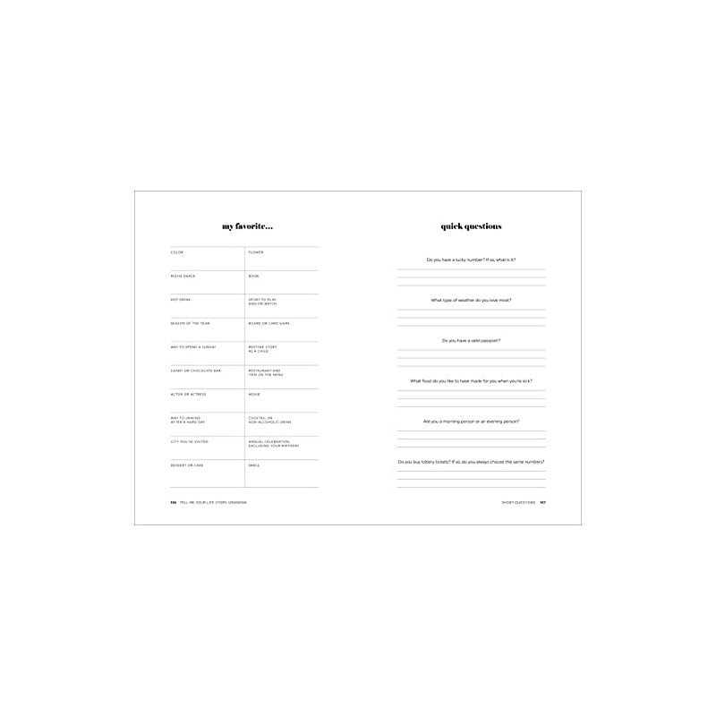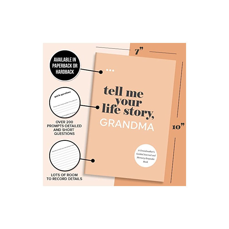 Create a timeless keepsake that will be treasured by future generations.Tell Me Your Life Story, Grandma is a beautifully designed gift to capture all of Grandma's precious memories and wisdom.This simple guided journal helps grandmothers record their life story with over 200 questions.The thought-provoking questions and prompts are organized into chapters based on your grandmother's life stages to help her record memories, experiences, treasured moments and reflections.Once completed, this gift will become a precious treasure and personal keepsake of your grandmother's most important recollections, stories and life lessons that can be passed down to your children, grandchildren and cherished by future generations to come. Ideal Gift. Makes a perfect and thoughtful gift for any occasion. Over 200 journal prompts. 126 detailed questions and 75 short questions. Elegant design. 122 pages. Beautiful interior design, divided into six chapters. Perfect Size. 7 x 10 inches (17.8 x 25.4 cm) For grandmothers of all kinds. The inclusive questions are suitable for all grandmothers and family structures. Printed in the USA. Proudly designed and printed in the USA.Available in both Hardcover and Paperback.
