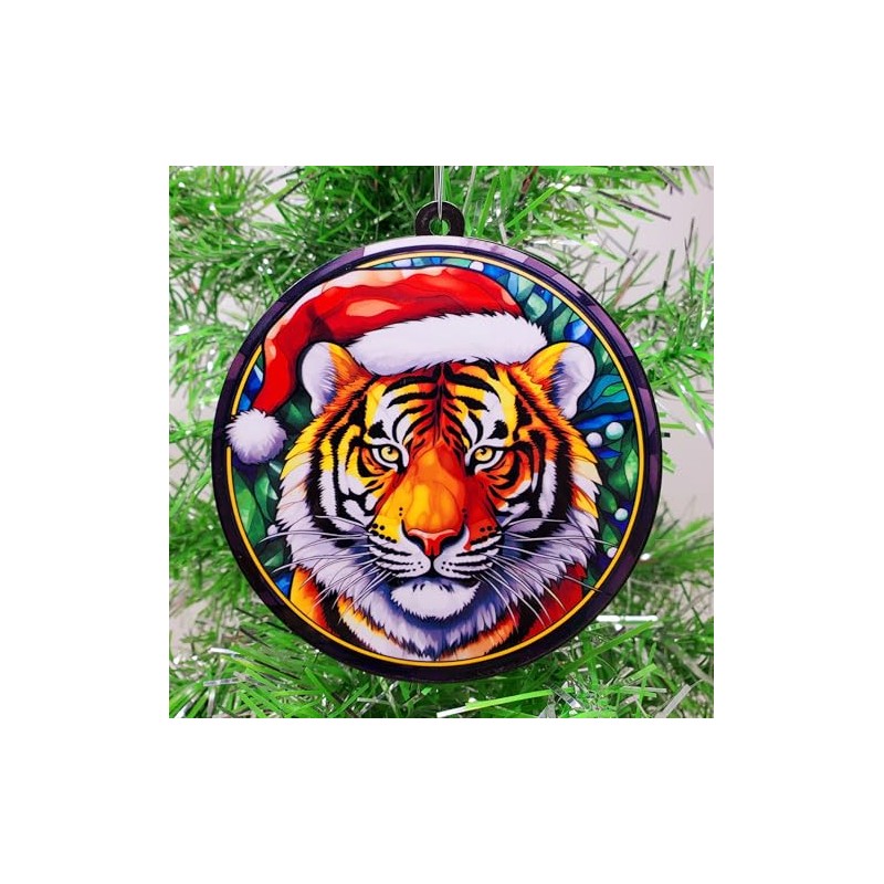 This tiger stained glass ornament is a stunning and unique addition to any holiday decor or wildlife enthusiast's collection. Crafted from high-quality stained glass materials, the ornament features a detailed depiction of a tiger, showcasing its distinctive stripes and powerful presence. Each piece is intricately designed with vibrant colors and intricate patterns that capture the essence of the tiger in its natural habitat. Perfect for nature lovers or those who appreciate wildlife art, this ornament adds a touch of exotic beauty and elegance to Christmas trees or decorative displays, celebrating the majesty and strength of tigers.