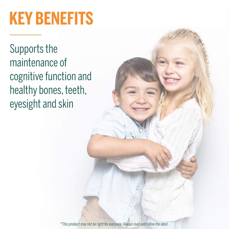 - Supports healthy bone growth, and helps support the development of the brain and nerves in children up to 12 years of age.