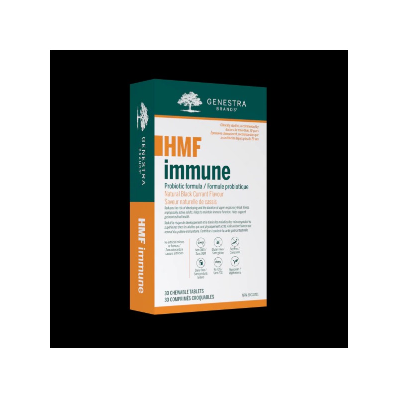 HMF Immune combines proprietary probiotics with vitamins C and D to provide targeted support for the immune system. Each convenient, once-daily chewable tablet provides a blend of five research-driven probiotic strains from both the Lactobacillus and Bifidobacterium genera. As nearly 80% of the body’s immunologically active cells are located in gut-associated lymphoid tissue, an important connection has been demonstrated between the intestines and the immune system. In addition to supporting gastrointestinal health, HMF Immune provides Bl-04, a strain that has been shown in a clinical trial to support upper respiratory tract health in physically active adults. Similarly, it offers CUL-60, CUL-21, CUL-34 and CUL-20, which were demonstrated in a clinical trial to support upper respiratory tract health in children when combined with vitamin C. To further help maintain immune function, HMF Immune contains vitamins C and D. Vitamin C supports the immune system by regulating lymphocyte proliferation, natural killer cell activity and immunoglobulin production, while vitamin D helps control T cell activation, cytokine release and phagocytosis in macrophages. Research demonstrates that vitamins C and D may be especially effective in maintaining immune function in the respiratory tract.*