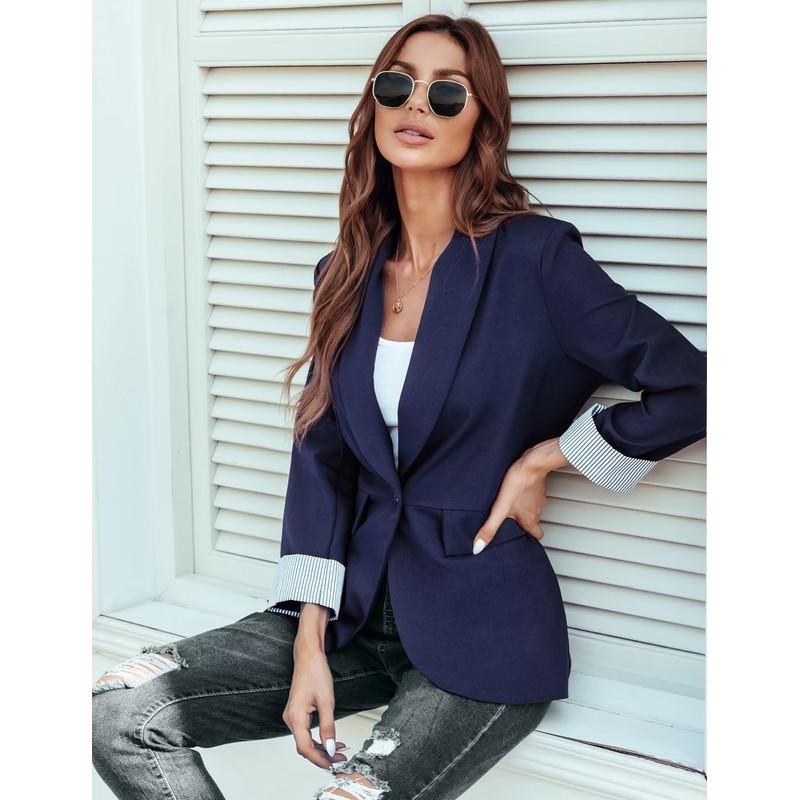 - ★ Classic Design: Basic blazer jacket for women, a single front gold button, shawl collar, long sleeve with folded striped cuffs, solid color/plain, decorative fake pockets