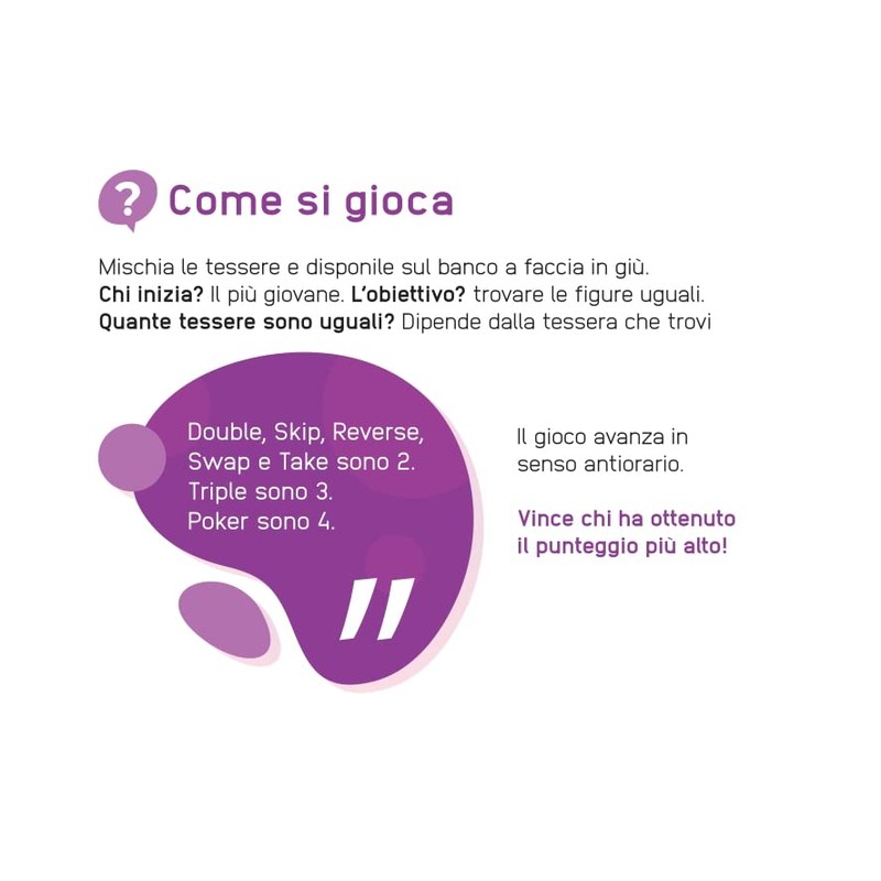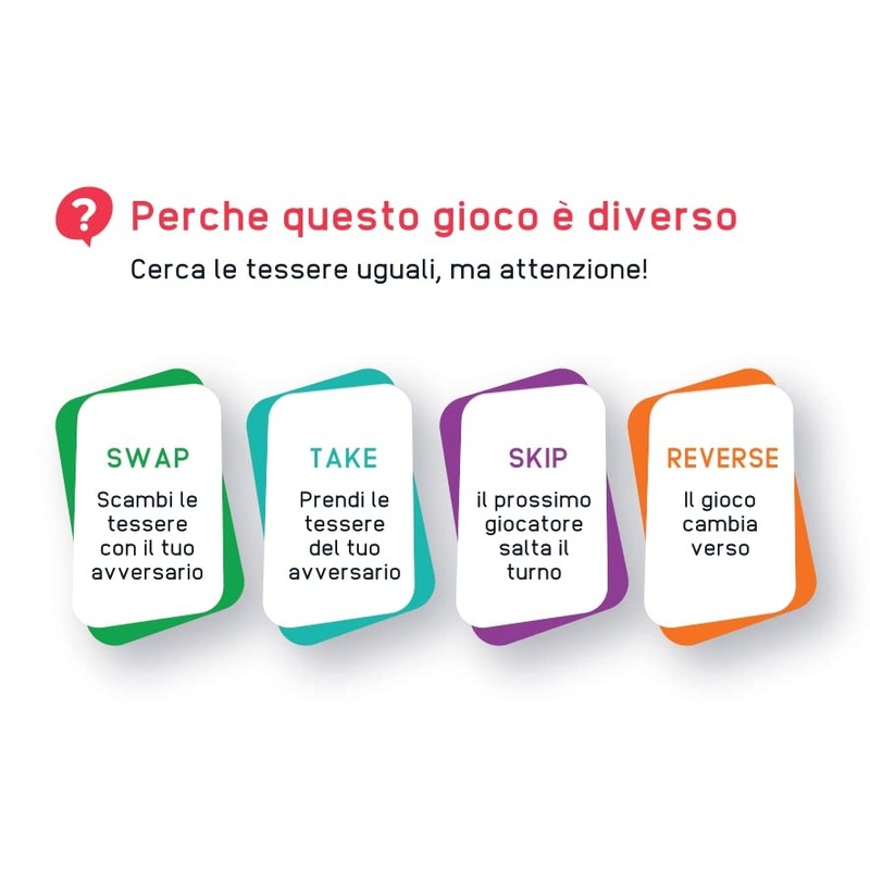The presence of special tiles (triple, poker, swap, skip, take reverse) makes the game of all similar games on the market. Blending ability and luck, making the games intact and exciting. The packaging is made of aluminium, elegant and durable, the 72 cards are very well made. The product is designed and manufactured in Italy.