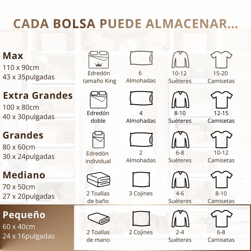 - 2 x BOLSAS PEQUEÑAS (60x40cm) - Perfecta para artículos pequeños como camisetas y ropa interior, ropa de niños y para viajar. Estas bolsas de compresión súper fuertes son ideales para almacenar la ropa fuera de temporada. ¡Las bolsas de sellado al vacío utilizan una potente succión para extraer todo el aire de artículos voluminosos como ropa, cortinas, almohadas, toallas, cojines, edredones, juguetes suaves y más! Cada bolsa almacena 6-8 camisetas, 2-4 jerseys, 4 Toallas de mano o 2 cojines