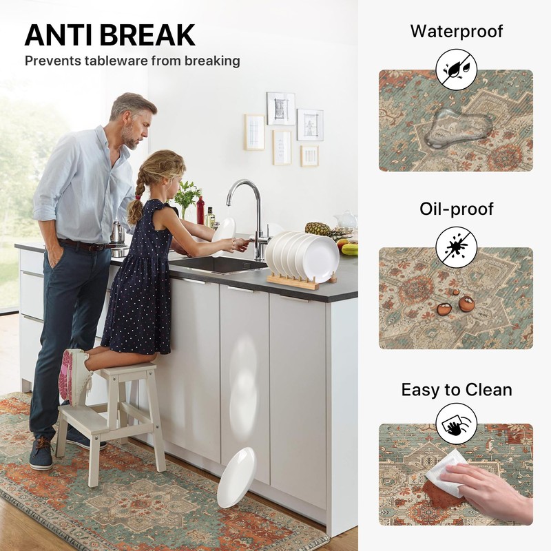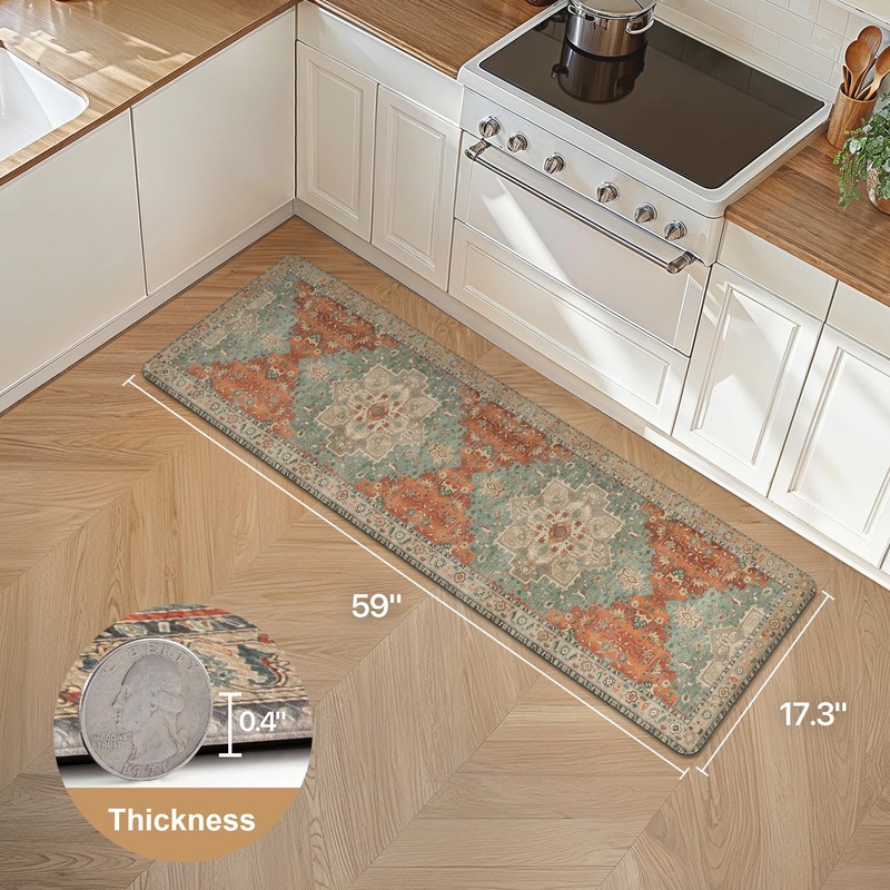 With exquisite craftsmanship and excellent quality, GENIMO kitchen mats for floor cleverly blend modern, classic and boho styles, elegantly showing the exquisite charm of retro aesthetics. The surface of these kitchen rugs are interwoven with complex floral patterns and charming colors, creating an eye-catching visual feast that adds brilliance to any space. Made of upgraded long-lasting rebound material, GENIMO anti fatigue mat provides excellent foot support, effectively relieve the discomfort of feet, knees and waist caused by long-term standing, and have unparalleled comfort and endurance. At the same time, the waterproof and surface design makes kitchen floor mat an ideal choice for splash prone environments. Whether engaged in cooking or cleaning tasks, these rugs for kitchen floor serve as a dependable helper to avoid oil stains from falling on the floor, enhancing the convenience of the kitchen. The non slip backing and surface checkered design increase friction, ensure stability on various floors, reduce the risk of slipping. The easy-to-clean surface makes maintenance simple and quick. Just wipe with a damp cloth or vacuum cleaner to keep floor mats clean for a long time, making your kitchen look brand new. Including a two-piece set design, GENIMO kitchen carpets are available in a variety of size options, suitable for a variety of scenarios such as kitchen, living room, floor, runner, sink, desk, office, laundry, etc, to meet your different living and home decor needs.
