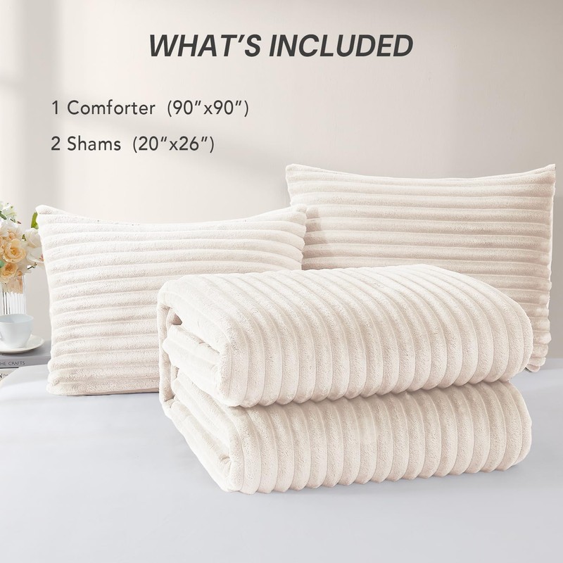 - Elegant Home Décor: The cream white fleece comforter set features a stylish stripe pattern on the flannel side, adding luxury and sophistication. Its dual-sided design complements any home décor, creating an affluent and polished bedroom look.