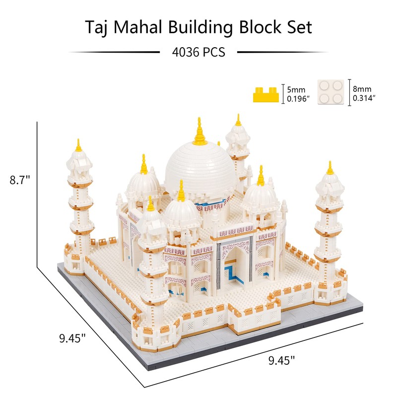 - World-famous Architecture: Taj Mahal is the new seven wonders of the world, known as perfect building in the world. Recreate this World-famous building step by step with these micro mini building blocks. There are 2 version models, which are standard version(4036 pcs) and mini version (2666 pcs).