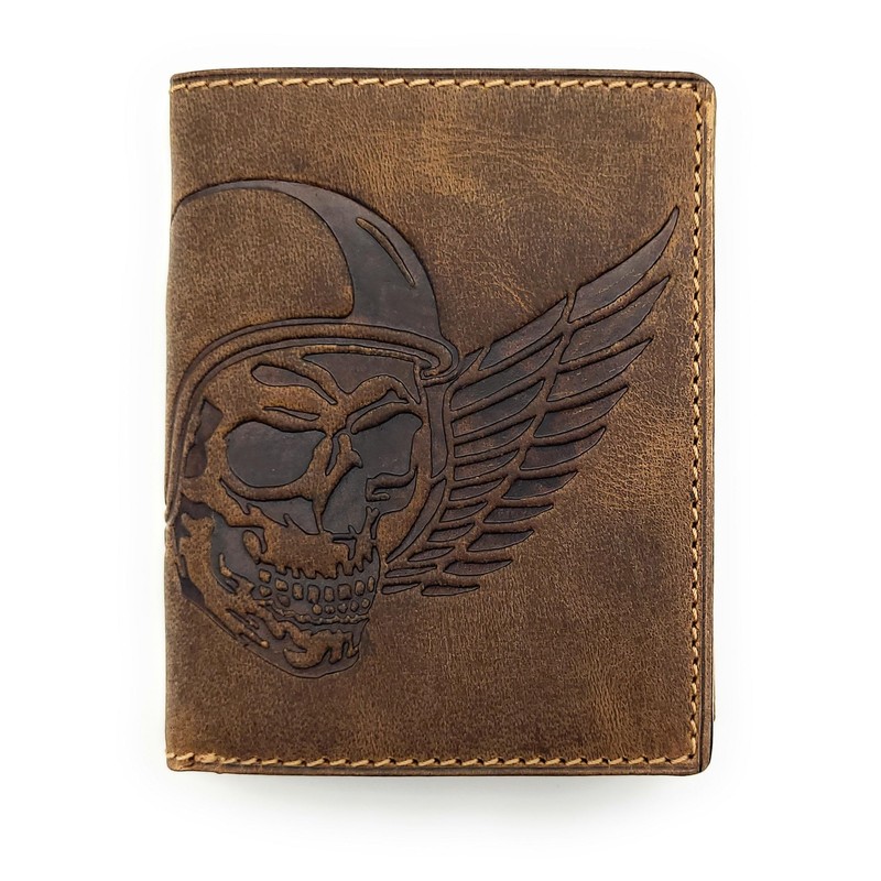 - Distinctive Design for Individualists The "Wing of Hell" buffalo leather wallet impresses with an eye-catching skull embossing that gives a rebellious and powerful look. Perfect for anyone who wants to make a statement with their style.