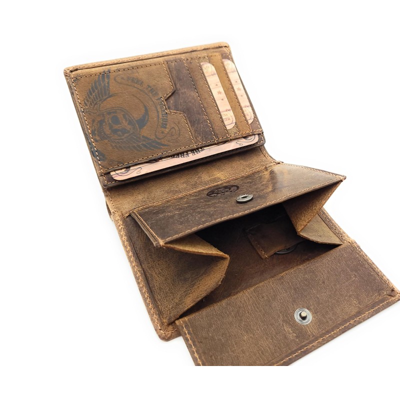 The "Wing of Hell" buffalo leather wallet is more than just an accessory - it represents independence and freedom. The distinctive skull design in leather gives it a powerful, mysterious look. Every detail has been carefully designed to highlight your personality and individual style.
