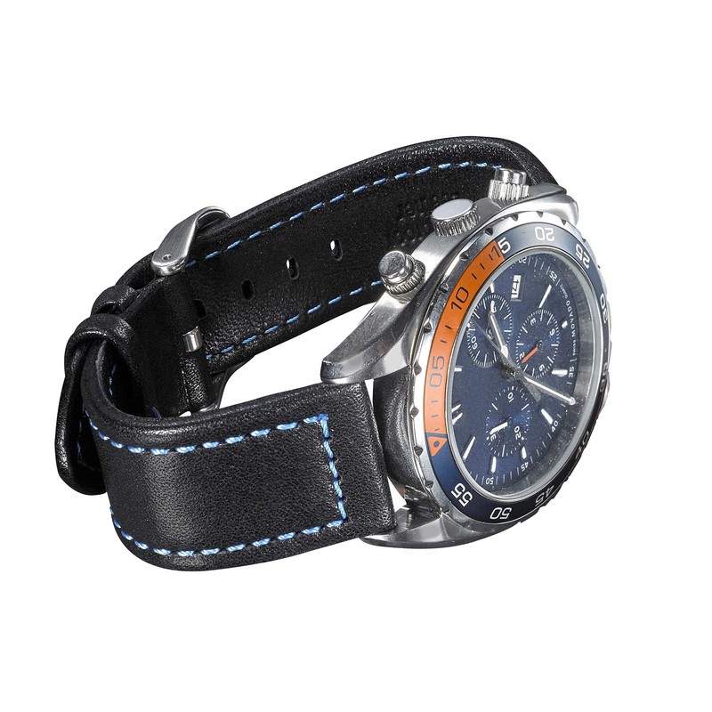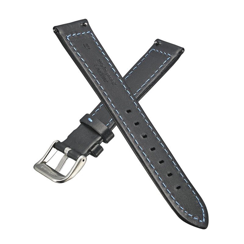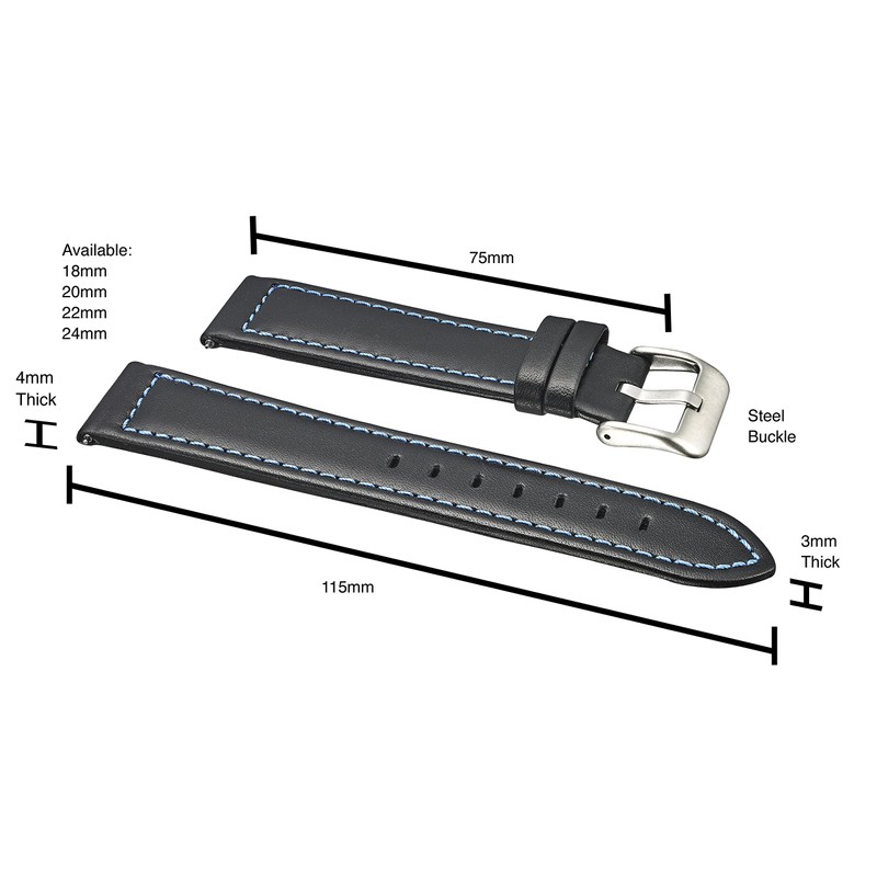Genuine Waterproof Leather Watch Band with Quick Release Spring Bars - Black Leather Watch Strap 20mm (Blue Stitching)