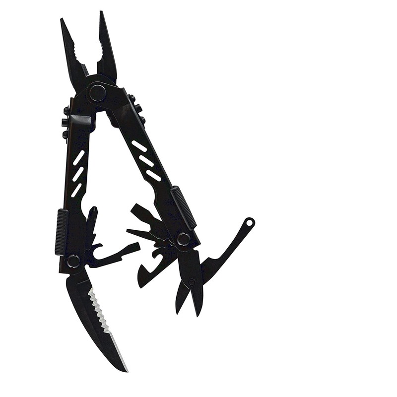 • Components: needle nose pliers, wire cutter, wire crimper, serrated knife blade, Fiskars scissors, cross point screwdriver, small, medium and large flat blade screwdrivers, can opener, bottle opener