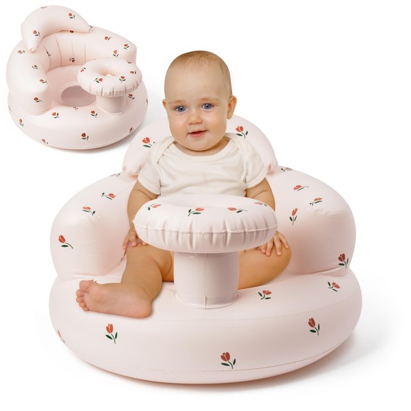 - Comfortable Design: Our inflatable baby seat feature a wrap-around design that makes it easy and safe to provide a comfortable seat for your baby. The bottom of the seat has a ventilation mesh to keep your baby breathable and cool. The wide backrest and high backrest protect your baby and provide a soft touch to prevent bumps. The red floral design attracts your baby's attention and keeps him or her securely seated in the bouncer.