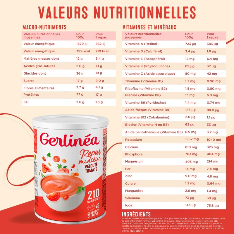- Contents: 1 glass of reconstitution powder for savoury soup Gerlinéa, 8 meals/box, tomato soup, net weight: 424g