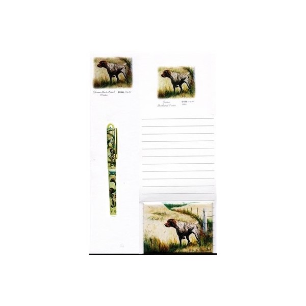 Renowned dog artist, Ruth Maystead, has created this wonderful gift set exclusively for us. Each set includes a notepad, a magnetic list pad, a roller ink pen and a magnet perfect for the refrigerator. All items in the set feature beautiful renderings of German Shorthaired Pointers. Makes a terrific hostess gift or stocking stuffer.*Note pad measures 6" x 8.5"*List pad measures 3.75" x 8.5"*Magnet measures 2" x 3"*Printed in the USA