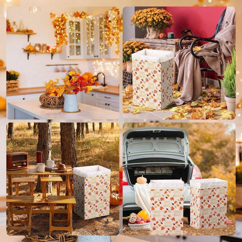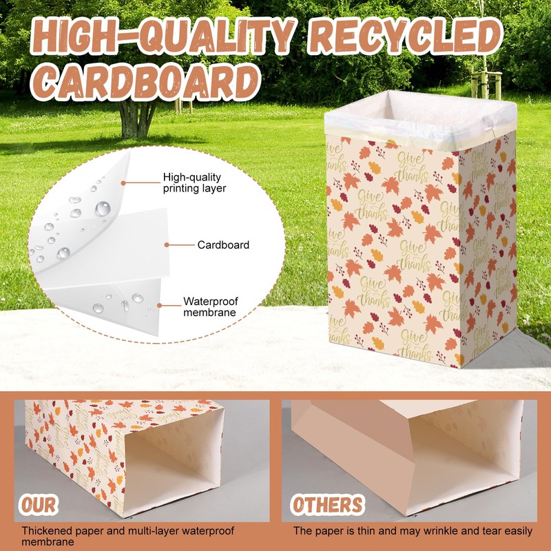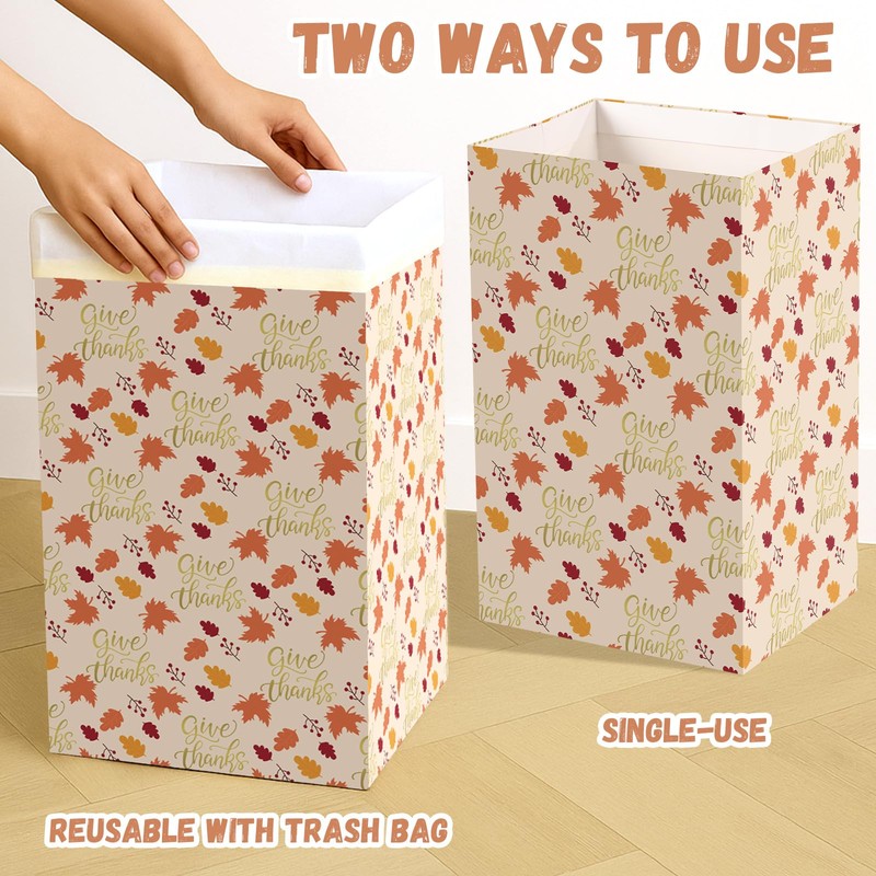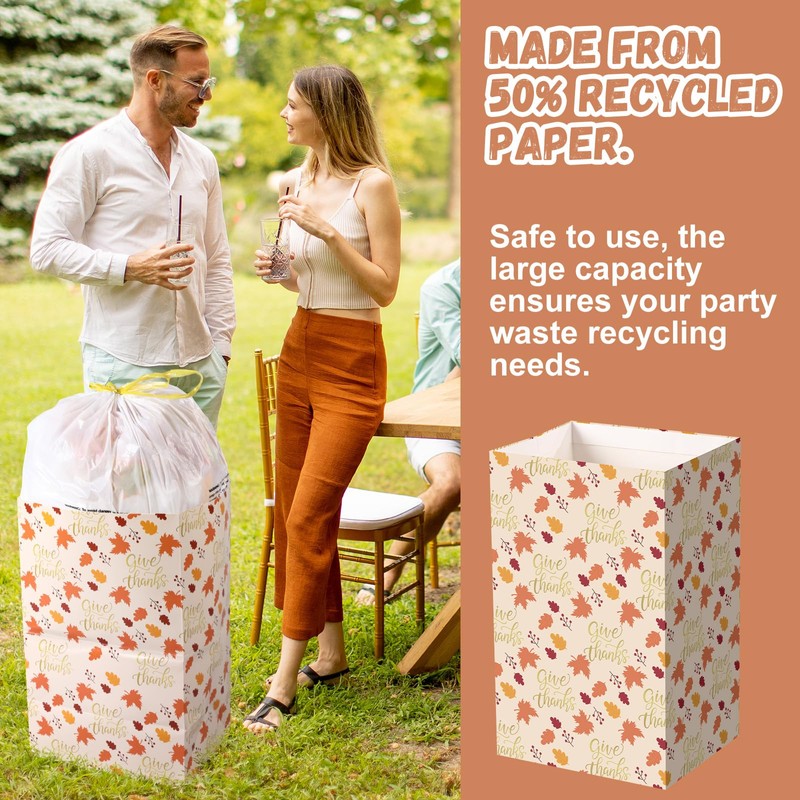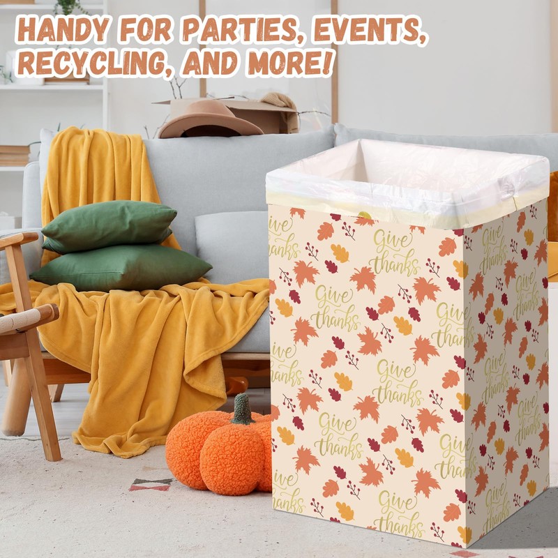 - Vibrant Festive Design: available in a range of colorful designs featuring stunning patterns like Thanksgiving-themed maple leaves, these garbage cans for party add a festive charm to any gathering; Ideal for parties and celebrations, they blend functionality with decoration