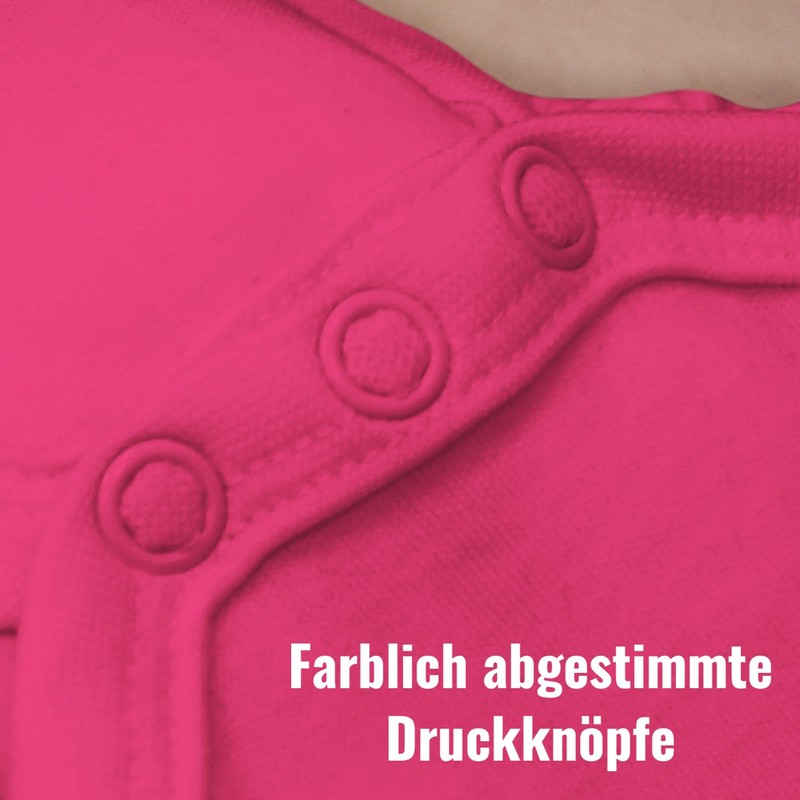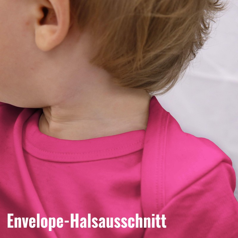 The baby bodysuit is made from 100% cotton. Thanks to an envelope neckline, narrow edged neck and armholes and the soft, elastic fabric, the baby bodysuit is particularly comfortable and allows maximum freedom of movement. The tone-on-tone press studs complete the picture wonderfully. By the way, these are nickel-free and completely harmless to health. So it can be chewed on it. The short-sleeved bodysuit is a basic baby clothing, a must-have in any baby wardrobe and can become a favourite piece with the matching funny saying or cool motif.