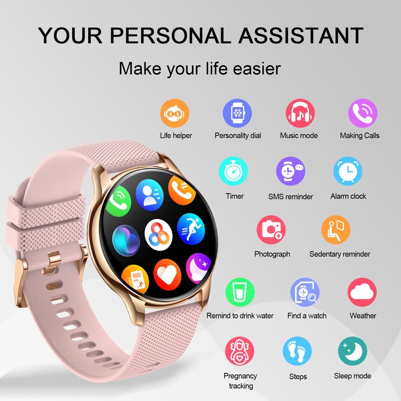 - All-round Health Monitoring : Women's fitness smartwatch has built-in upgraded biosensors support to detect your 24/7 blood pressure, blood oxygen, and heart rate, also monitor sleep status automatically, and you can set up a sedentary reminder, a women's menstrual cycle reminder, and a drink water reminder to help you adjust your living habits for a better life. There are other functions to choose like a timer, alarm clock, weather forecast, camera, music player, Ai voice, password lock, and stopwatch.