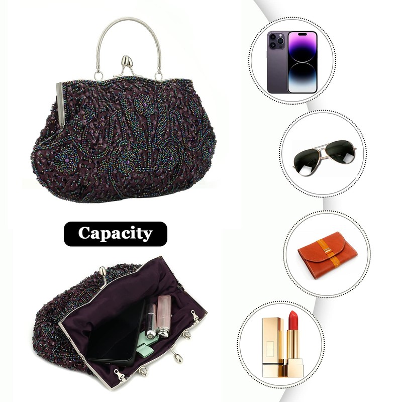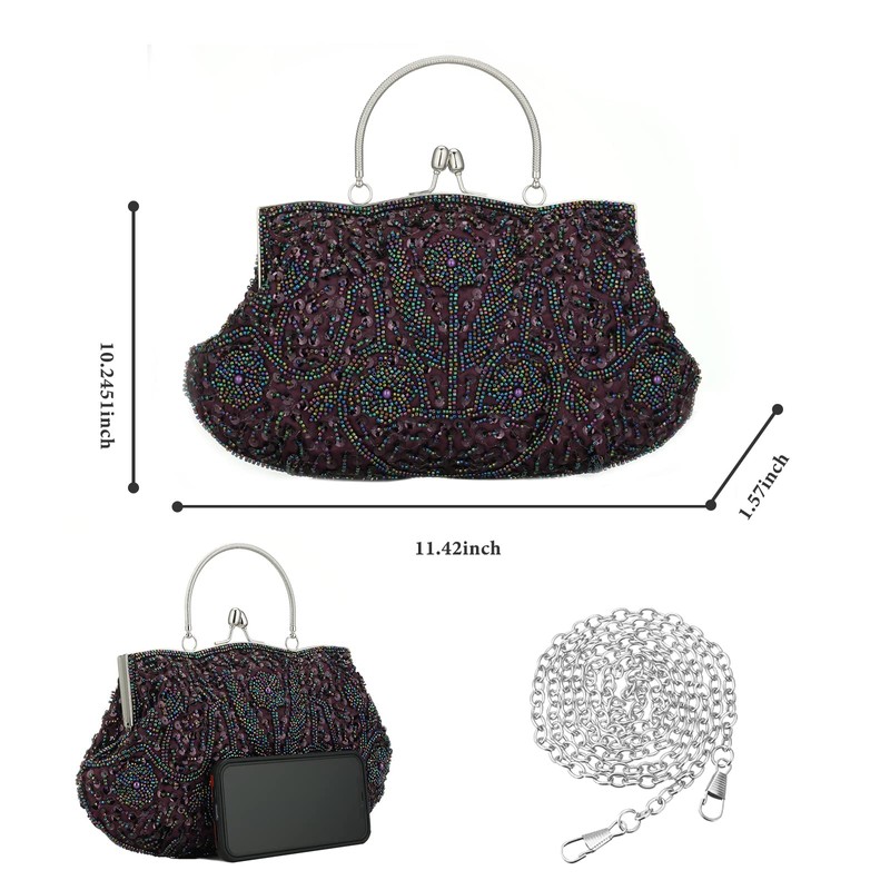 - Material: This evening bag is made of high quality and special Polyester and the outside is covered with tiny glass beads floral.