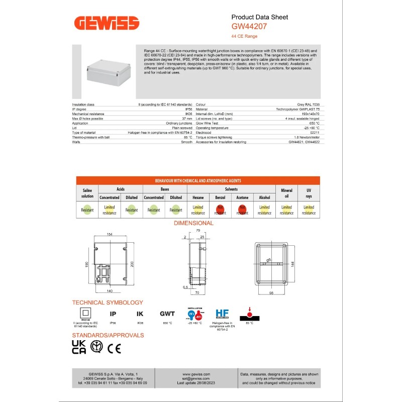 GEWISS GW44207 Junction Box With Plain Screwed LID - IP56 - 190x140x70mm, Smooth