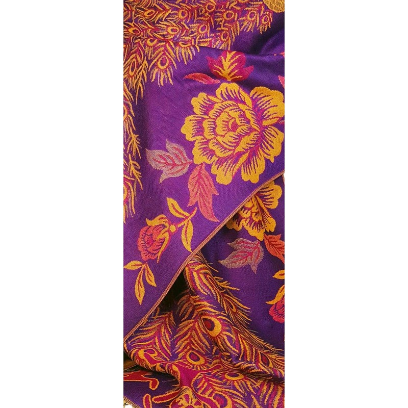 - Style DK1909 This is a GFM pashmina style scarf with a gorgeous peacock and floral pattern. Thicker than other styles. Weight: 270 g. Hot. Approximate size: length 180cm + 10cm tassels. Width: 70 cm. Material: Viscose
