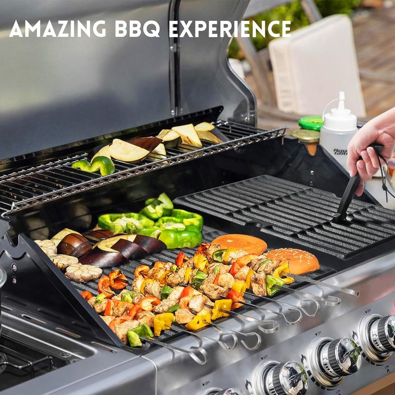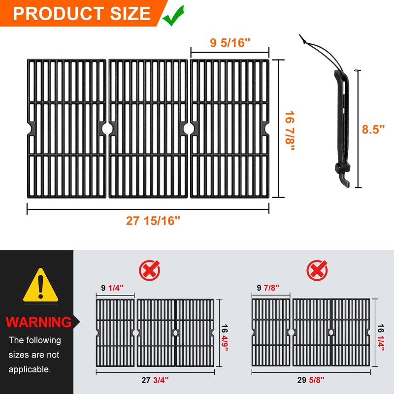- 【Package】: includes 1 set of grill grates (2PCS) and 1 grate lift tool.【Dimensions】: 16 7/8"L x 9 5/16"W inches for each, 16 7/8"L x 27 15/16"W inches for 3 PCS grates. The grates lift tool is 8.5"L