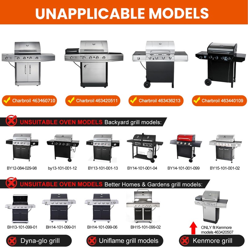 - 【Replacement for Charbroil grill models】: 461442114, 463420507, 463420508, 463420509, 463420510, 463420511, 463436213, 463436214, 463436215, 463436413, 463439915, 463440109, 463440109B, 463441312, 463441412, 463441512, 463441513, 463441514, 463460708, 463460710, 463461613, 463461614, 466420909, 466420911, C-45G3CB