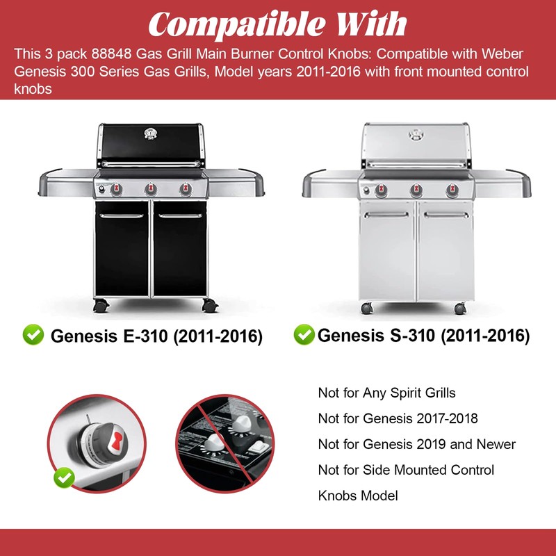 - 💪 Compatibility: Gas Grills Burner Replacement Knobs Compatible with Weber GENESIS E-310 (2011-2013 MODELS) GENESIS E-320 (2011-2013 MODELS) GENESIS E-330 GENESIS EP-310 GENESIS EP-320 (2011-2013 MODELS) GENESIS EP-330 GENESIS PREMIUM CEP-330 GENESIS S-310 GENESIS S-330 etc.