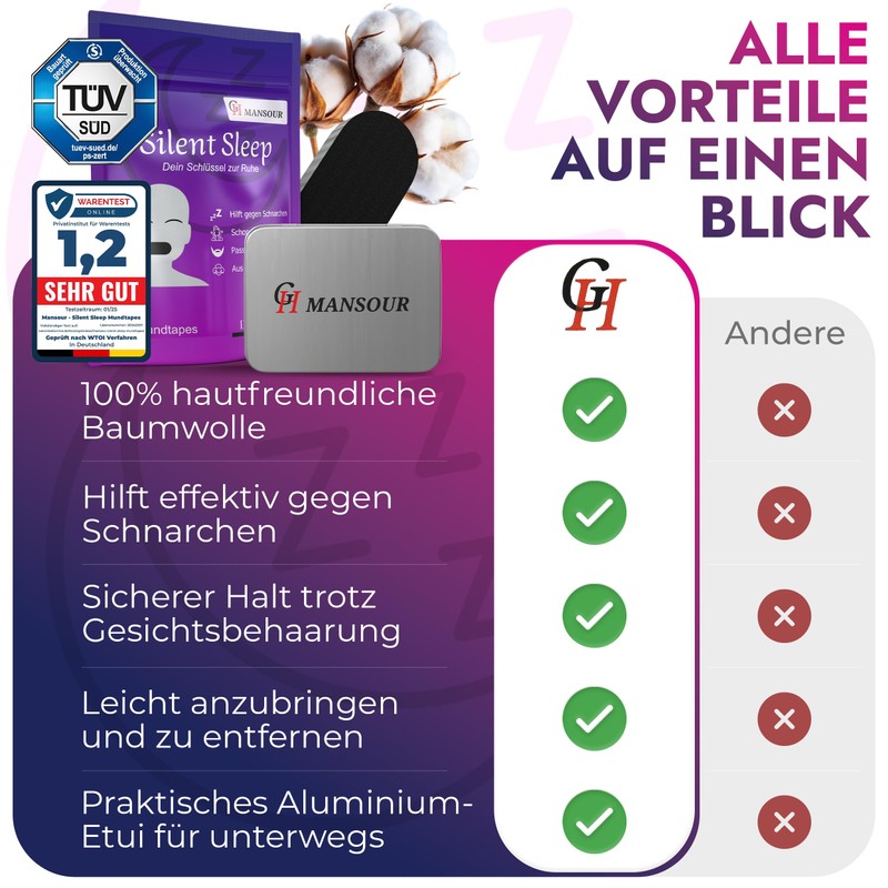 Erleben Sie die Vorteile unserer natürlichen, hautfreundlichen Mundpflaster aus Baumwolle und verabschieden Sie sich von unruhigen Nächten! Bestellen Sie jetzt die GH Mansour Mundpflaster mit Etui und genießen Sie erholsamen Schlaf, Nacht für Nacht.