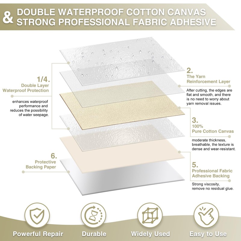 - Double Waterproof Coating & Anti-Yarn Separation Technology:The canvas fabric layer is impregnated with waterproof coating,the double waterproof layer excellently and effectively prevents rainwater penetration,making it suitable for outdoor use.The repair patch adopts anti-yarn separation technology,which makes the yarn of the patch more firm and tight,the edge is smooth and neat after cutting, the yarn is not easy to loose and separate,which is more durable than other similar products