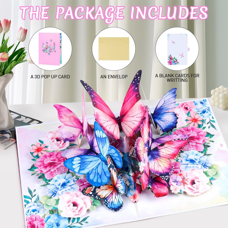 - 3D pop-up card: Embark on a beautiful journey through nature with our enchanting 3D pop-up butterfly card. Open the birthday card and see a 3D scene with lifelike flowers and butterflies fluttering around. They stand for beauty, sincere thoughts, good love and blessings.