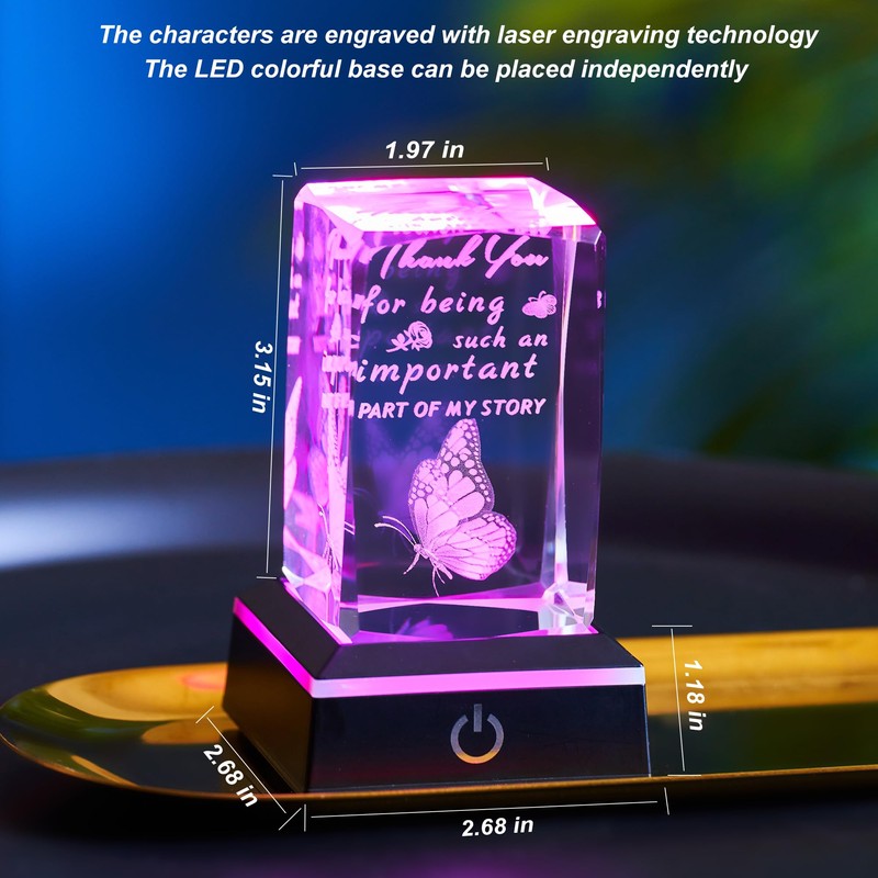 - High quality K9 crystal and laser engraving technology: eternal clarity, lasting emotions. The crystal cube made of high-purity K9 crystal showcases vivid three-dimensional butterflies and clear text, achieving lifelong sharpness (no fading, scratches or wear!) through laser engraving. The set includes: 3D crystal, color changing LED base, elegant gift box (no packaging required!) greeting card, cleaning cloth. Everything is for a clean and worry free gift giving experience