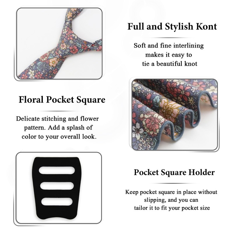 - Floral Tie Set: Self tie floral tie*1, matching floral Pocket Square*1, and pocket square holder *1; This men's floral necktie set is a big surprise for colleagues, boyfriend, dad, grandpa, son, friends, lover, and also a special treat for yourself