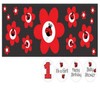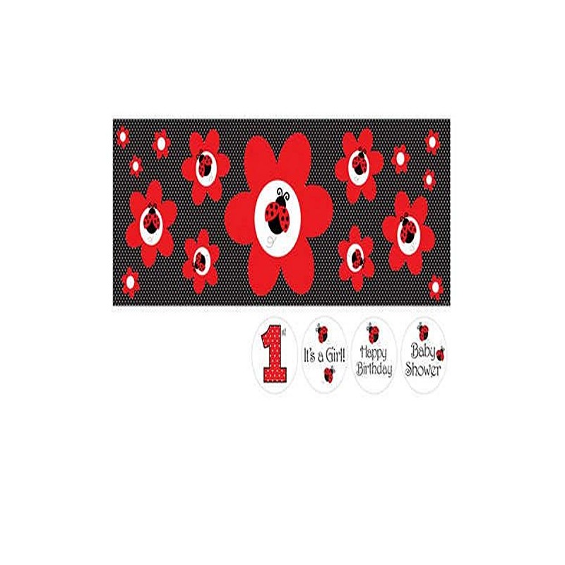 - This banner kit features multiple images of a ladybug perched on a red flower with 1st, It's a Girl, Happy Birthday, and Baby Shower stickers for customization.