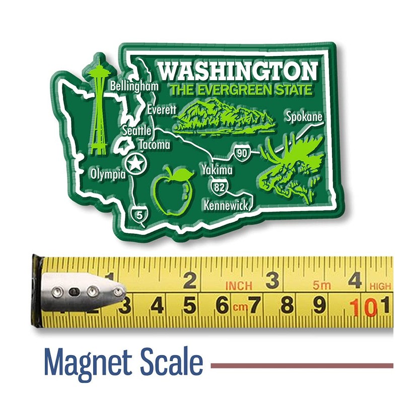 This 3D flexible rubber refrigerator magnet is a giant reproduction of the popular collectible Washington state map magnet. The large souvenir magnet measures 2.4" x 4.4" and is 0.100" thick. This Classic State Magnet is perfect for any refrigerator or metal surface and makes a great gift or Souvenir! Made in the U.S.A.