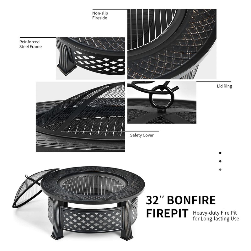 - Excellent Material & Sturdy Frame: Our firepit is made of premium steel with high-temperature resistance finish, which is rustproof and can withstand various weather conditions for long time service. What’s more, the heavy-duty steel frame with 4 stable feet ensures the fire pit will not be easy to shake during use.