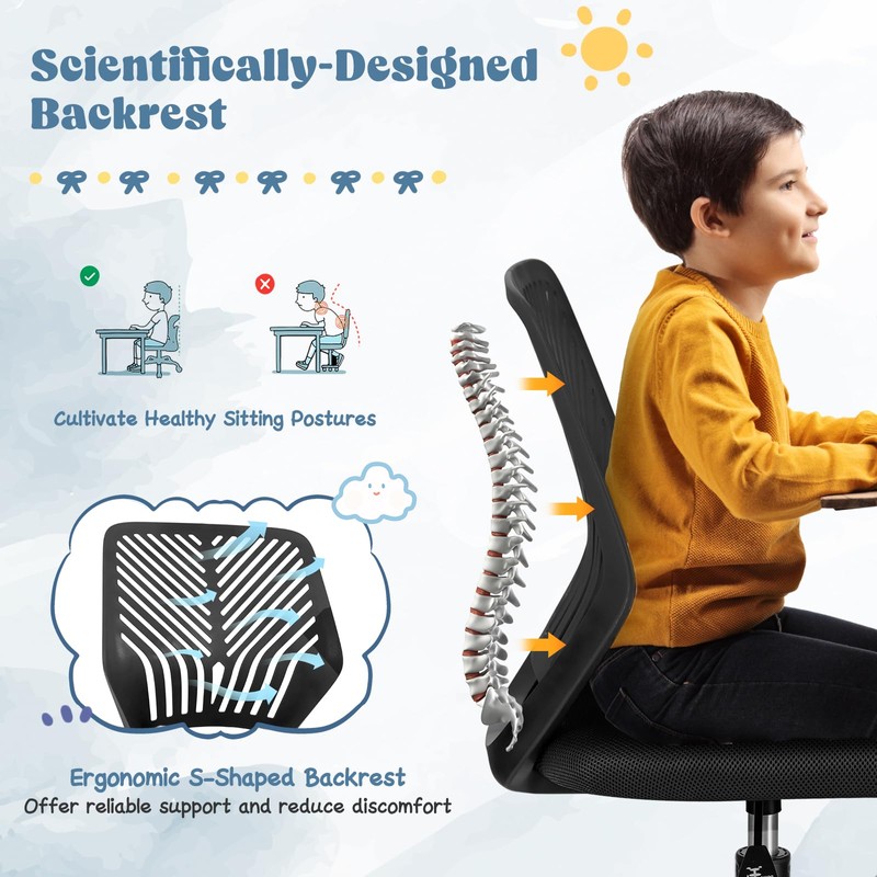 - [Ergonomic Support]: This kids desk chair is designed with an S-shaped backrest that provides full support to the back and lumbar region, promoting improved sitting posture during long office hours and study sessions. Its hollowed surface increases airflow and reduces heat buildup for added comfort.