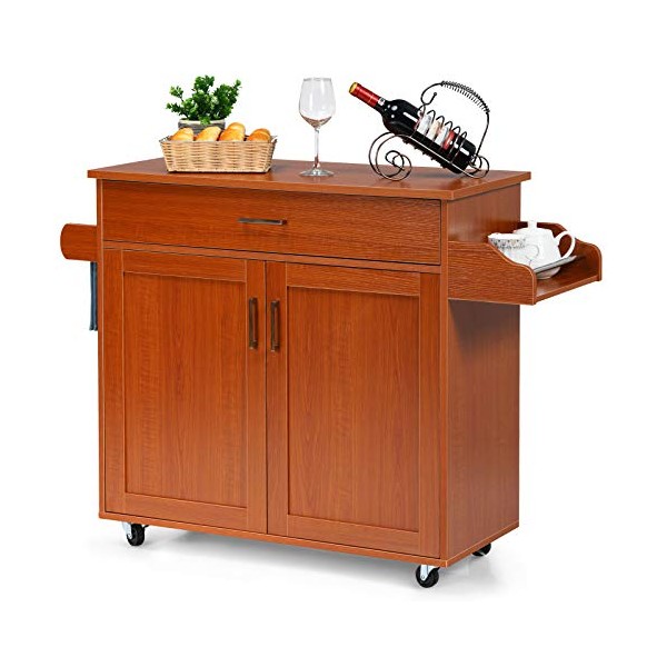 Giantex Kitchen Island, Rolling Kitchen Cart with Spice and Towel Rack, Large Drawer & 2-Door Storage Cabinet, Home Service Cart on Lockable Wheels, Wood Kitchen Trolley, Spacious Tabletop (Cherry)