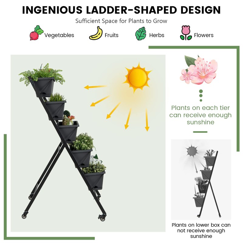 - [ 5 Container Boxes]: The vertical raised garden bed is equipped with 5 spacious container boxes, perfect for cultivating different types of vegetables, fruits, flowers, herbs, etc. Additionally, the cascading design enables plants on each tier to receive sufficient sunshine.