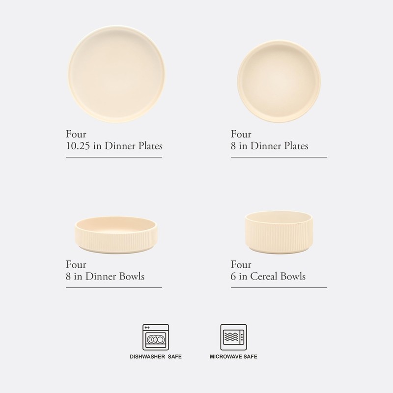 • FOUR PLACE SETTINGS: This complete set includes four 10.25-inch dinner plates, four 8-inch dessert plates, four 8-inch dinner bowls and four 6-inch cereal bowls. Suitable for a service for four and a spread filled with homemade meals and authentic conversations.