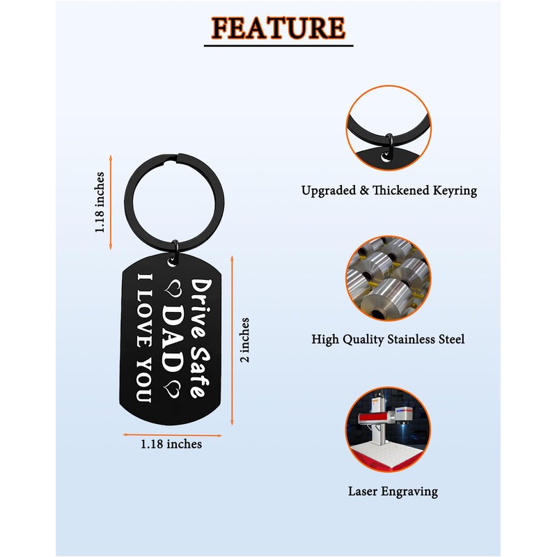 - Personalized Gift: Engraved stainless steel keychain with 'Drive Safe Dad' and a heartfelt message, making it a thoughtful present for Father's Day or any occasion.