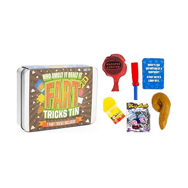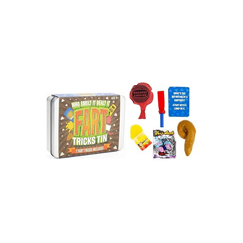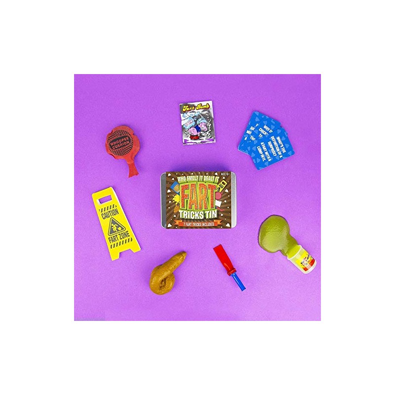 • Includes fake poop, fart whistle, warn cards, noise putty and a fart bomb