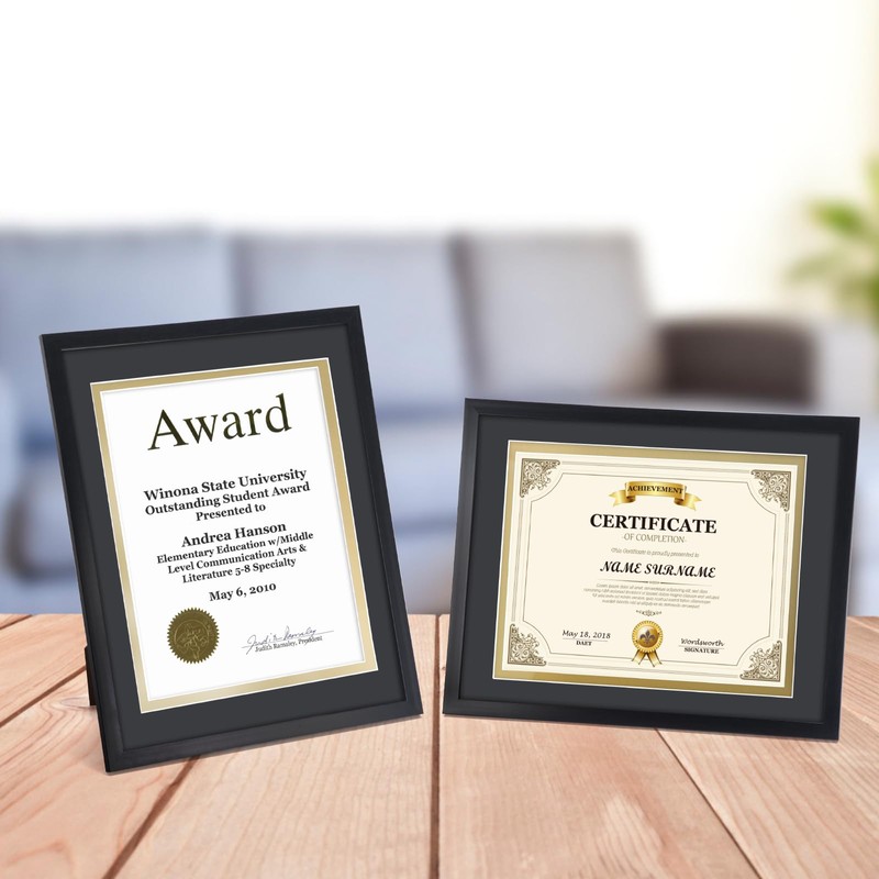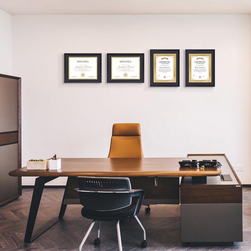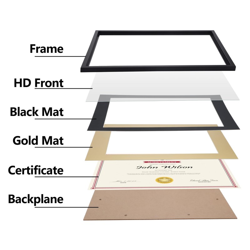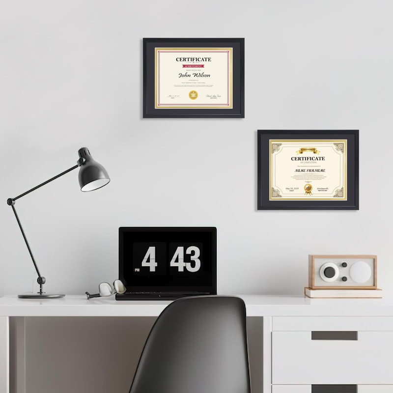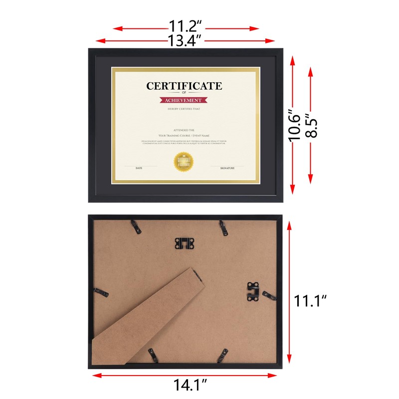- Versatile Design: These 11x14 frames are perfect for 11x14 inch posters without mats or 8.5x11 inch documents, certificates, diplomas, and more with mats. A combination of black and gold mat adds a touch of elegance, creating a visually appealing border that enhances the beauty of your displayed images.