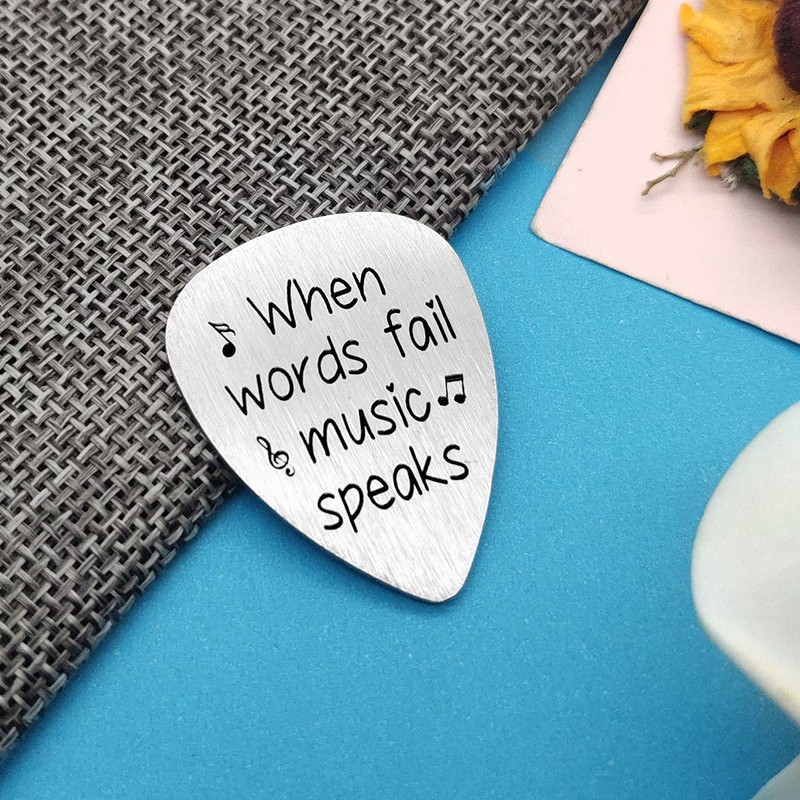 - Guitar Pick Gifts: Engraved with “When Words Fail Music Speaks”. The words is a great way to express the love of music.